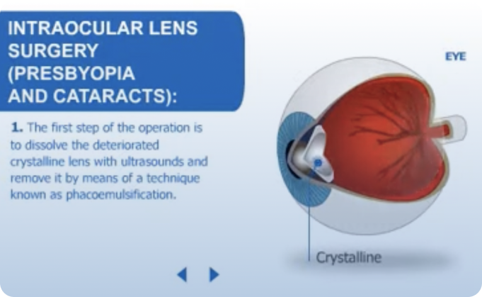 The first step of the operation is to dissolve the deteriorated crystalline lens with ultrasounds and remove it by means of a technique known as phacoemulsification. Next, the crystalline lens is replaced with an intraocular lens (artificial crystalline lens) which will last a lifetime and will not get opacify. Thus, thanks to the artificial multifocal crystalline lens cataracts (if any) are eliminated, presbyopia is corrected and any associated refractive issue (myopia, hyperopia or astigmatism) is solved or minimised. In case that the patient does not suffer cataracts, this technique will prevent them. After this procedure, the patient can go home with the uncovered eye and his recovery will be very fast.